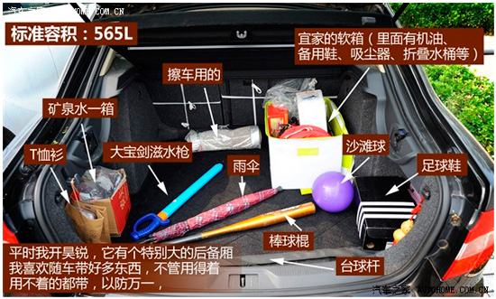 作为巨蟹座,我买车时首当其冲就是要把车当家,后备厢、手套箱或其他犄角旮旯必须能装各式东西,也正因如此,我选择了昊锐。不怕各位笑话,身边的朋友看见我的“宝物”都会问:弄个折叠水桶干嘛?随车带着衣服、鞋干嘛?装着棒球棍子干嘛?通常我的回答都是:万一想擦车呢;万一下雨被浇了呢;万一碰上劫道儿的呢等等。总之,我喜欢带很多东西上路。
