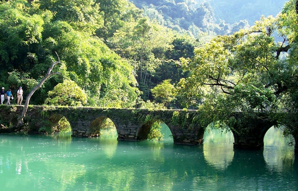 小七孔古桥是景区标志式的景点,景区之名由桥而得。这是一座小巧玲珑的七孔古石桥,桥长25米,桥面宽4米,拱高4米,建于清道光15(1836)年,昔为沟通荔波至广西的重要桥梁。桥由麻石条砌成,桥身爬满藤蔓和蕨类;两岸古木参天,巨大的虬枝沿着桥伸臂,宛如巨伞撑在桥上。古色古香的桥下是绿得令人心醉的涵碧潭。古桥倒影碧水之中,七孔幻化为七面镜子,我中有你,你中有我,分不清哪是桥哪是水,水天树桥浑然一体,展现出一派神仙洞天。人置于景中,见证了这一经典,并传诵着这一永恒。