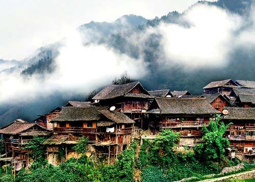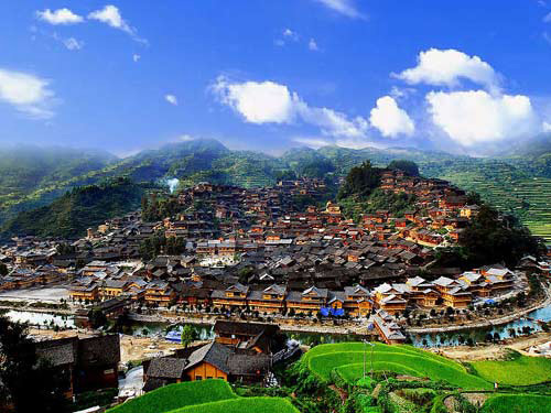西江千户苗寨位于雷山县东北面,距县城37公里,距州府凯里39公里。西江有1250多户,5600多人。为全国最大的苗寨,是苗族第五次大迁徒的主要集结地,被誉为苗族的大本营,素有"苗都"之称。进入苗寨,民族特色的建筑如吊脚楼举目皆是,建筑物傍水而建,依山延伸,看不到尽头。等我们登上西边的山头,更被眼前的景象所震撼!那对面的吊脚楼一户挨着一户,成片成片的往山顶伸展,欲与天公试比高,气势恢宏,场面壮美!坐在吊脚楼的“美人靠”上欣赏着眼前的一切,让我不由想起08年游桂林龙胜大寨梯田所看到的情景。梯田的大气壮观和眼前的之景有异曲同工之妙。它们都充分展示了勤劳的苗族人民“人定胜天”的自信和气魄。我不停的按下快门,唯此才能表达我们对蚩尤后人的无比崇敬。这次来苗寨,本想带小孩看看盛大的芦笙歌舞会,可惜等我们赶到中心歌舞场时,表演刚好结束,好生遗憾。不过小女在我们的鼓励下穿上了苗族服装走了场时装秀,还蛮有点意思。