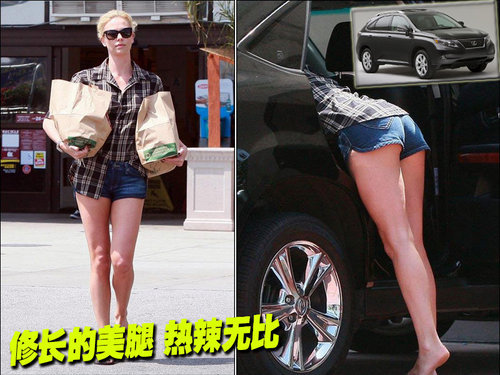查理兹·塞隆也同大部分美国人的习惯相同,喜欢驾驶大型SUV车型。从图片我们可以看出,查理兹·塞隆驾驶的是一辆雷克萨斯SUV车型RX。同时她也热爱着改车,从这辆车的镀铬轮毂就可以看出。查理兹·塞隆身穿格子衫配超短裤外出购物,在往后备箱里放东西的时候,查理兹·塞隆不经意间,露出了整条修长的美腿,绝对的香艳十足,热辣无比。从她走路的姿势还可以看出迪奥的影子,只不过华丽的晚装变成了格子衫和超短热裤。