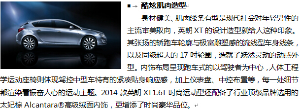自2010年上市以来,五门轿跑车别克英朗XT一直都是中级车市场时尚与运动的代名词。它融汇了别克所赋予中级车的最佳动感基因,不仅是别克高档轿跑车系的明星产品之一,更是中级运动车细分市场高端的强势主角。而最新上市的2014款英朗XT以更为动感、科技的升级体验,为钟情操控乐趣的消费者带来惊喜,并且为2014年的别克S弯注入新的激情。