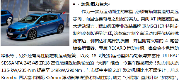 欧洲消费者对车辆的运动操控性能更加偏爱,也更为挑剔。而两厢掀背车由于体型相对较小,重量较轻,具有操控灵巧敏捷、提速快的天赋优势,并且价格也更易被接受,因而在欧洲大行其道。欧宝雅特是两厢掀背车的佼佼者之一,自1991年正式上市以来,仅前三代产品的累计销量就已经超过了1000万辆。第四代欧宝雅特通过对运动性能给予大力强化,结合卓越的时尚设计,更为市场所瞩目。在中国,别克品牌通过英朗XT,将欧风操控的精髓原汁原味地呈现给消费者。