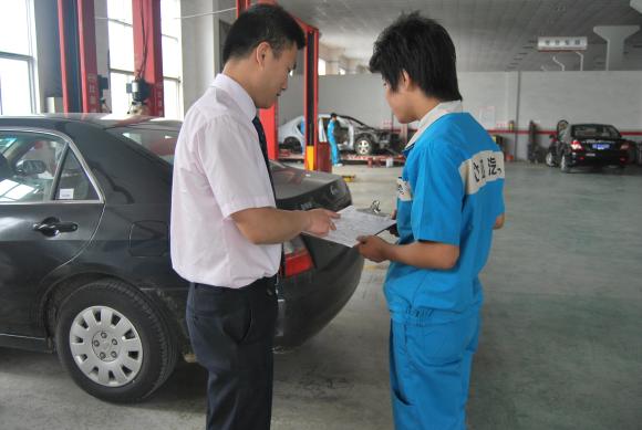 登记完毕后,服务顾问将车驶入维修保养车间,并将保养的项目与维修人员认真的接洽。