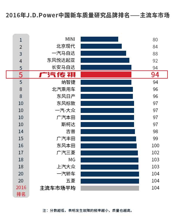 2013年,广汽传祺以97分,远超行业平均119分的优异成绩,跻身合资前列,高居中国品牌榜首,一举冲破 J.D. Power报告历年来“没有一个中国品牌超过新车质量行业平均水平”天花板,同时也有力回击了专家关于“10年内中国汽车品牌无法达到J.D. Power新车质量行业平均水平”的预言,成功为中国品牌正名。2014年,传祺又以整体排名第14、中国品牌第一的成绩将中国汽车品质提升至一个全新高度,同时在传祺效应的带动下,2014年,6个中国汽车品牌得分超过行业平均分。2015年,传祺再次以96分的优异成绩超越众多合资品牌名列整体第8,中国品牌第一。2016年,以传祺为首的中国品牌保持了持续的进步,进步幅度在过去六年里显著大于国际品牌。今年中国品牌和国际品牌之间的表现差距仅为14个PPM,J.D.Power预测中国品牌将在2018年达到国际品牌的质量水平。
