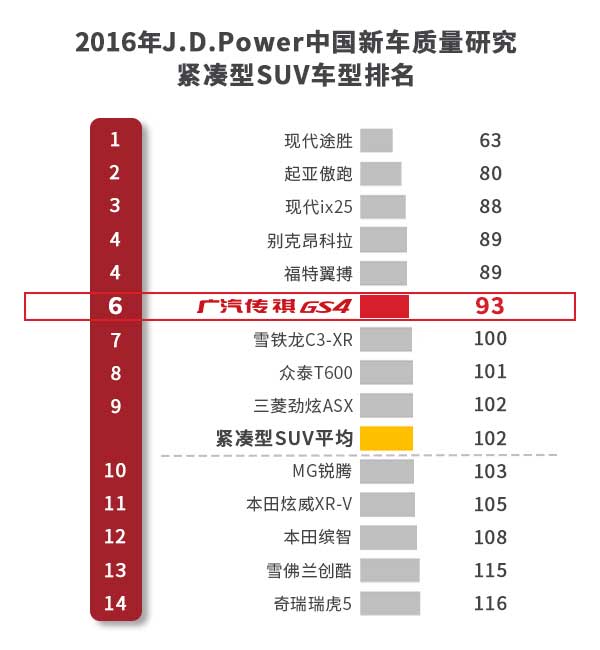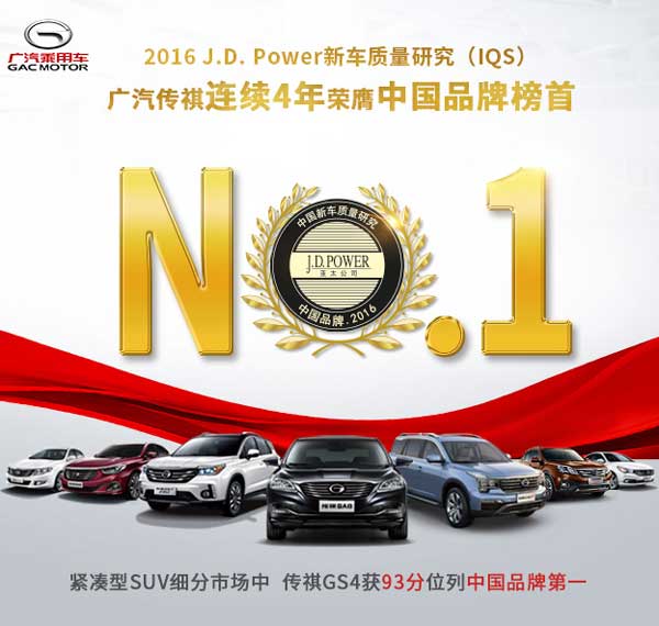 9月29日,J.D.Power亚太公司发布2016年中国新车质量研究(IQS)报告。广汽传祺排名相比2015年度提升3位,全行业排名第五,取得中国品牌历史性突破,连续四年获得中国品牌第一。同时,在紧凑型SUV细分市场排名中,传祺GS4以93分的成绩摘得中国品排第一的桂冠。以广汽传祺为首的中国品牌新车质量持续大幅提升,展现出蓬勃的发展力量。