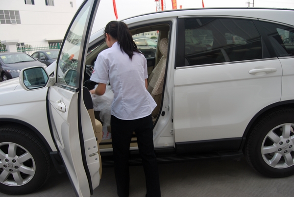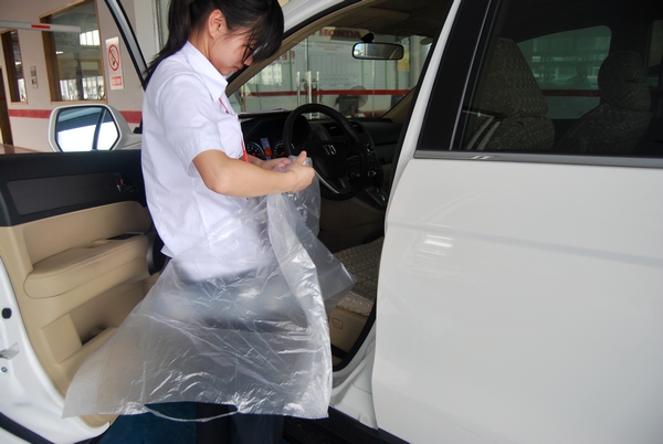 服务顾问为保养车辆铺上防尘套件,并询问客户车辆使用状况,需要保养哪些项目。