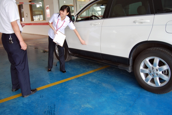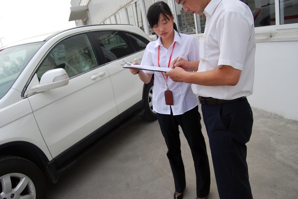 服务顾问与客户一起,对车辆进行环车检查,对后备箱、车内贵重物品一一登记,并让客户确认后签字。