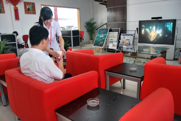 服务顾问将客户领到客户休息室,并热情的递上茶水。
