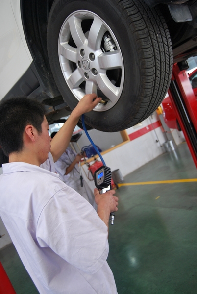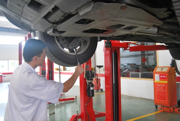维修人员将车辆升起,对车辆的底盘部件零件进行检查加固,对轮胎气压进行测量,及换取机油。每一项都有条不絮的进行着。