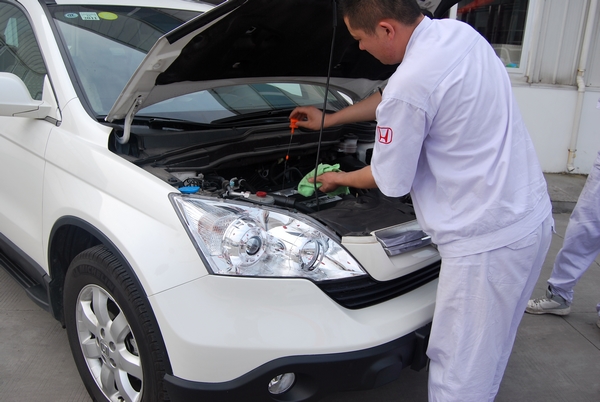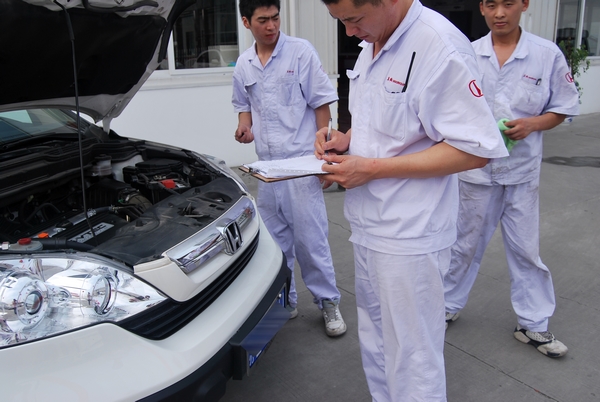 维修人员为车辆铺上防刮防垫,并对车辆的空气筛、水箱、机油等进行仔细的检查。