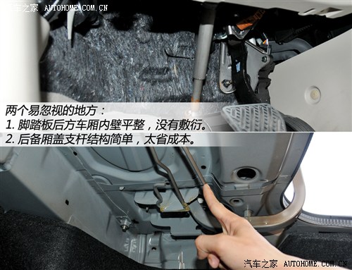一些隐蔽的细节值得注意,比如脚踏板后面的车厢内壁,平整度很高,没有敷衍了事,这是好的地方,也有不好的,像后备厢盖支杆就用了最简单的结构,太节省成本。
