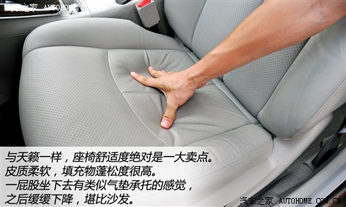 座椅绝对是轩逸的一大亮点,造型宽大,皮质柔软,填充物蓬松度很高,堪比沙发,舒适度为同级别最高水平,足以说服最挑剔的屁股。