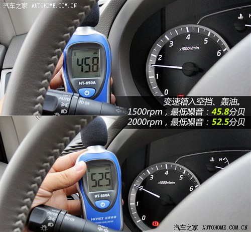 关闭所有车门车窗,发动机怠速状态,此时噪音仪显示,车厢内最小噪音值可低至40.7分贝,变速箱挂入空挡、轰油,1500rpm下的最低噪音值为45.8分贝,2000rpm下的最低噪音值为52.5分贝。这几组数据表现都相当优秀,令人印象深刻,但车辆没有开起来,反映的情况不全面,算是个小试验吧。