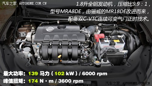 说了半天该聊聊动力系统了,这台测试车搭载1.8升全铝自然吸气发动机,型号MRA8DE,看着有点眼熟吧,它跟骊威的MR18DE 1.8升发动机关系密切,只是进排气都具备了连续可变气门正时技术,参数上也高了一些。