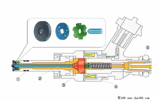 高压喷油嘴结构示意图:①高分子密封圈;②喷嘴针阀;③衔铁;④电磁线圈;⑤细滤器