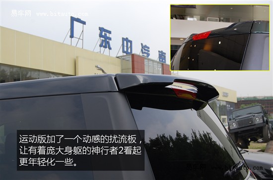 对于路虎来说,很少会有运动版的车型出现,这款从去年年底就开始备受国内消费者关注的神行者2运动版车型已经抵达广州。近日,易车网编辑前往位于大观南路上的中汽南方对这个运动版的神行者2进行了实拍,大家可以从图解中了解到,运动版与普通版相比,在外观上有明显的变化。  从45度角看,很明显就可以发现有多处与普通款不同的地方,运动版加了更动感的前大包围和特别设计的19英寸合金轮毂。更多的运动套装让神行者2看起来更加年轻化了。